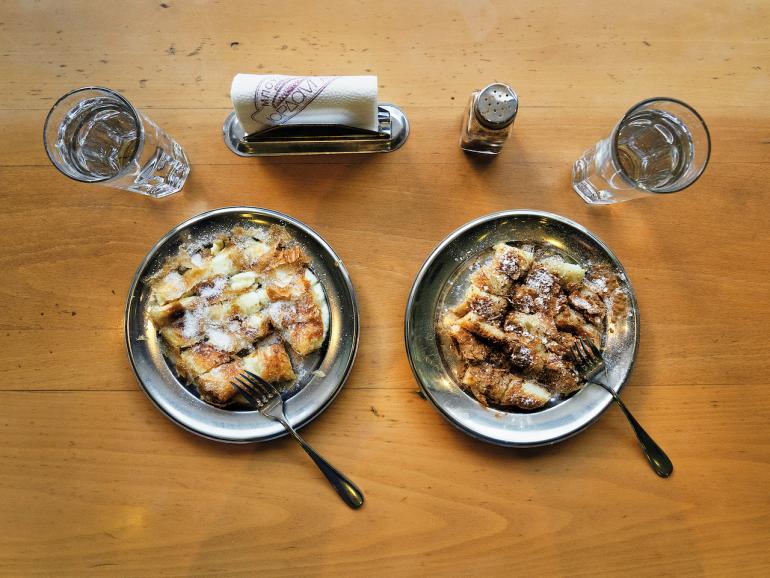 Early mornings are reserved for Bougatsa, a traditional pastry of wafer-thin layers of phyllo with a savoury or sweet filling and sprinkled with powdered sugar. Chania’s oldest bougatsa shop is Iordanis; they’ve been making it with local Mizithra cheese and serving it hot on tin plates for the better part of a century. A local secret is the bougatsa made with curd and olive oil from Tomadakis, a great option if you want something different.