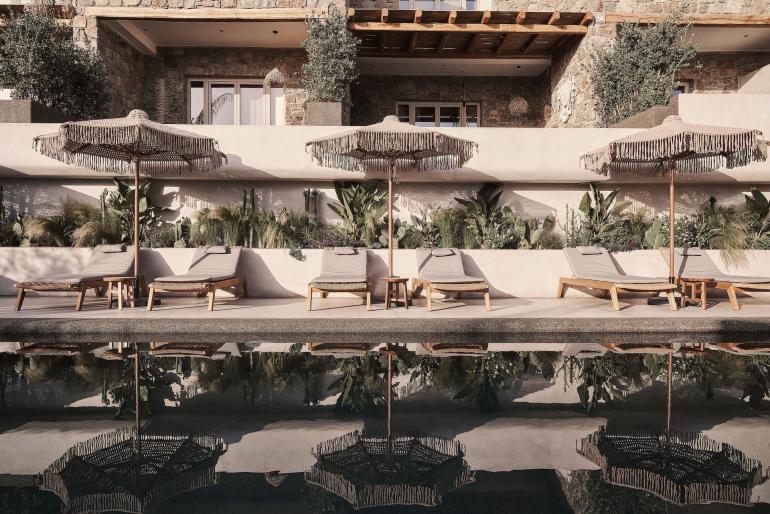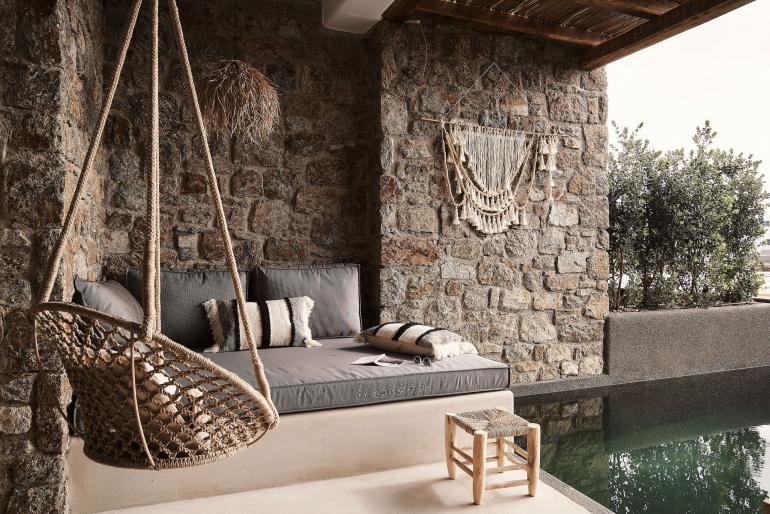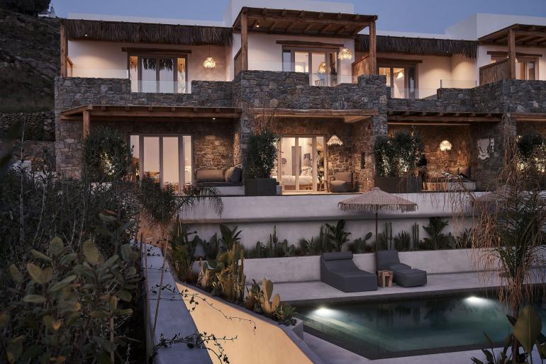 Διαθέτοντας εσωτερικούς χώρους σε γήινες αποχρώσεις, πέτρινους τοίχους, χειροποίητα ξύλινα έπιπλα και διακόσμηση από φυσικά υλικά, το ξενοδοχείο τιμά την κυκλαδίτικη παράδοση και το φυσικό περιβάλλον της περιοχής. Προσφέροντας, μεταξύ άλλων, πολυτελείς σουίτες με ιδιωτικό μπαλκόνι και θέα στον κήπο, αλλά και σουίτες με ιδιωτική πισίνα, υδρομασάζ και πανοραμική θέα στη θάλασσα, το ξενοδοχείο επιτρέπει στους επισκέπτες να ζήσουν την απόλυτη εμπειρία hide-away απόλαυσης.