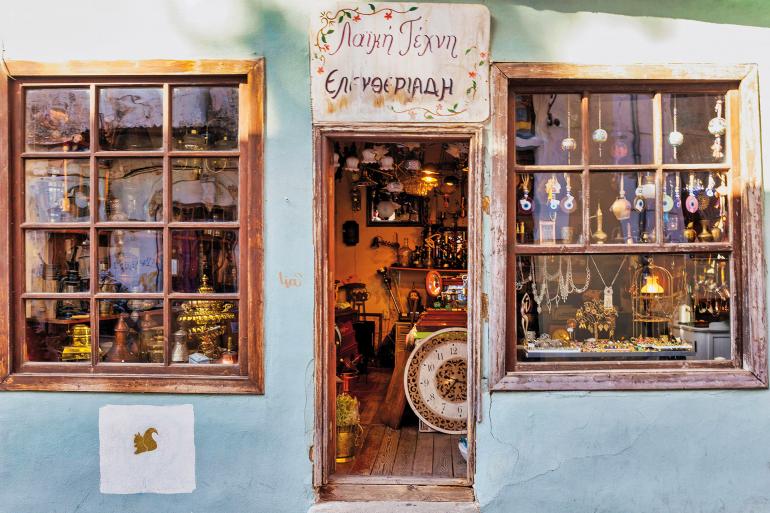 On the historical tobacconist street of Venizelou, the mansions –old symbols of the city’s wealthy patrons– have become museums and businesses telling of a glorious past. This is evident in the childhood residence of Manos Hadjidakis, the celebrated Greek composer. In today’s Antika Square, in the heart of the Old Town, shops sell antique treasures.