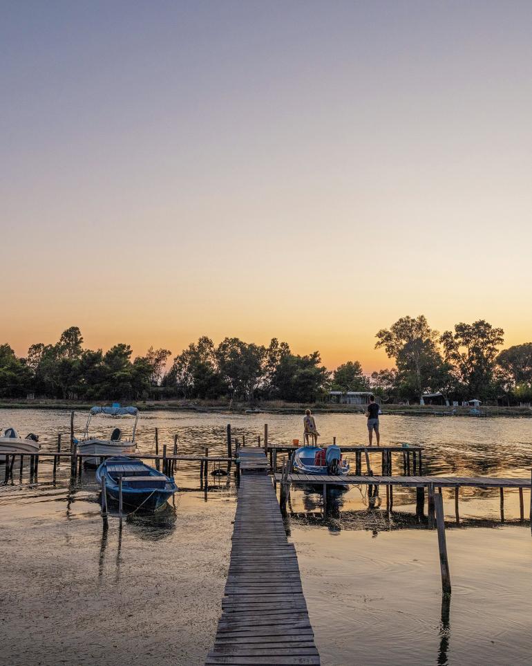 Not far are the Pelades (humble fishermen’s huts). Their Neolithic architecture incorporates posts made of elm, tamarisk supports and roofs woven of straw and thin reeds. Today, most are transformed into country homes, but the pelades are still the refuge of fishermen and their families, a respite for tsipouro and seafood meze between shifts.