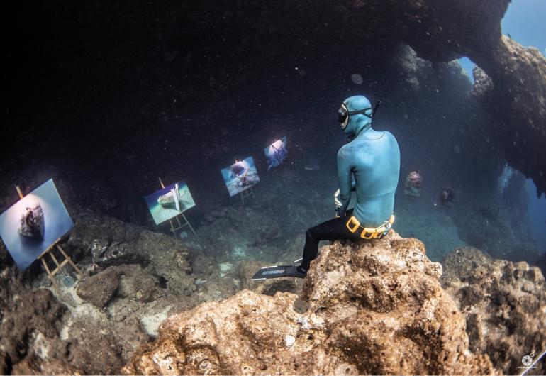 These days, Stefanos dives with support from his team, On a Single Breath. Together, they capture fantastic imagery of marine life and otherworldly landscapes beneath the waves. In 2018, he and his team revealed Underwater Gallery, an exhibition of their work submerged in a cave in Amorgos, complete with ambient lighting at the gallery entrance, exit and upon the easels – a much celebrated feat in the international art community and the first of its kind in the world.