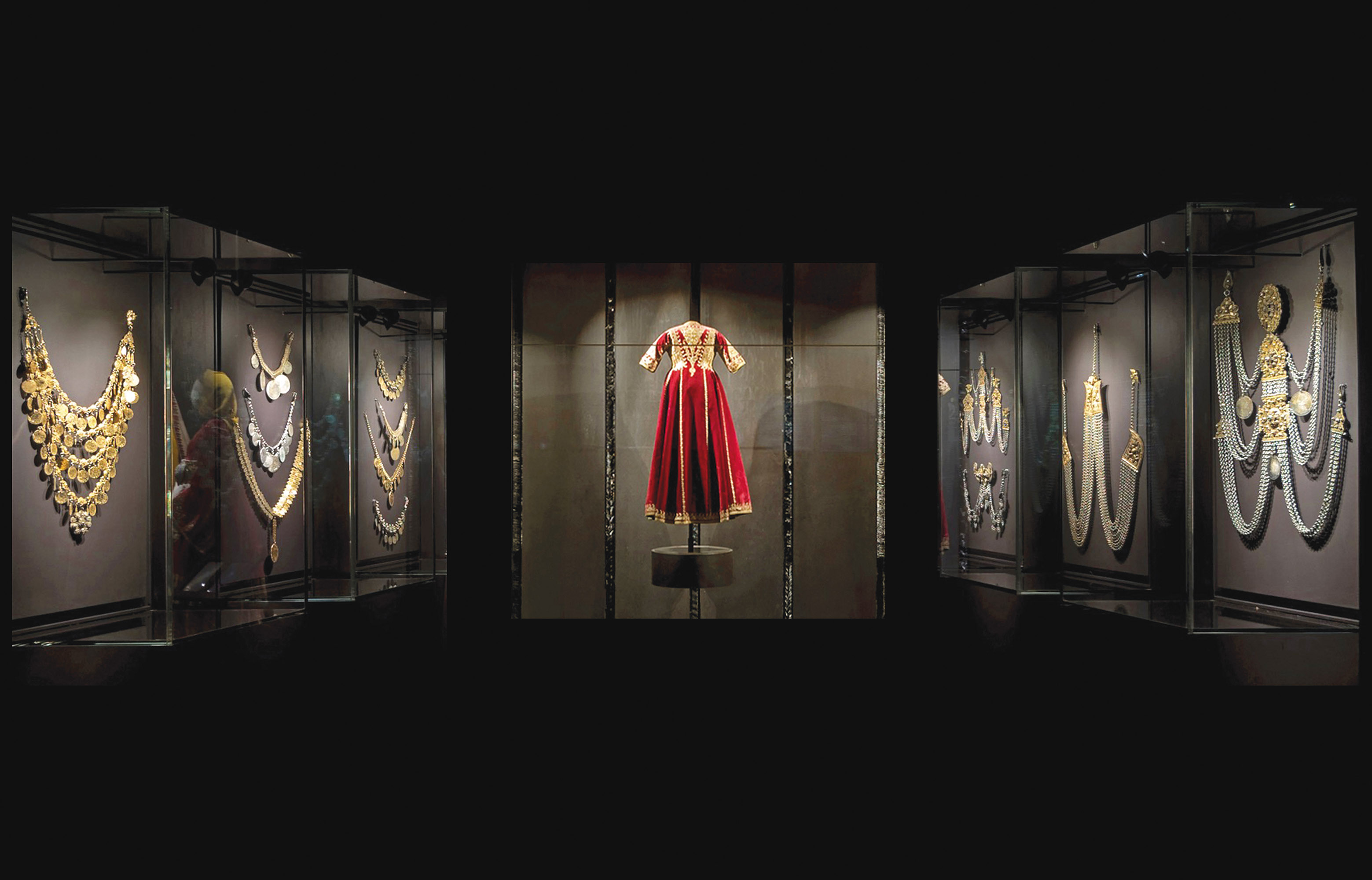 The exhibition includes about 80 complete costumes, both men’s and women’s, as well as some gold-embroidered overcoats and pieces of jewellery from all over Greece. As for their presentation, the exhibit follows the typology of prominent scholar Angeliki Hadjimichali. Accordingly, there are three categories of classification; costumes with Segouni (thick-woollen coats), Kavadi (long garments) and frock coats. These categories are on exhibit on three floors, respectively. They begin on the ground floor and move upwards. The exhibits connect via a three-storey moving showcase, suggesting their continuity with the people who wore them.