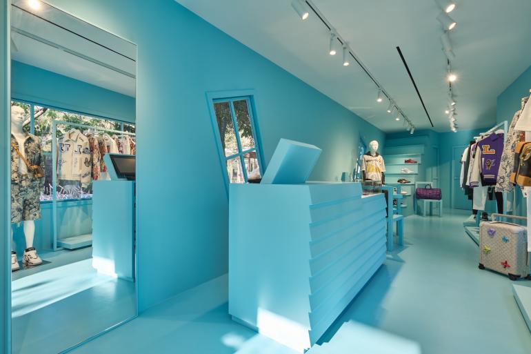 Imaginative with irregular windows, the space welcomes clients with two large staircases on each side of the room. A new world where the surreal becomes real, the Fall-Winter 2022 reinvents the winter wardrobe with a blend of reinvigorated staples alongside new and exciting designs. A full range of ready-to-wear, accessories, fragrances, shoes, and leather goods are on offer. These include the “LV Paint Can” bags in a rainbow of 6 different colours, and “This is Not Monogram” pieces - Virgil’s tribute to Louis Vuitton’s signature, with a surrealistic dream-like twist.